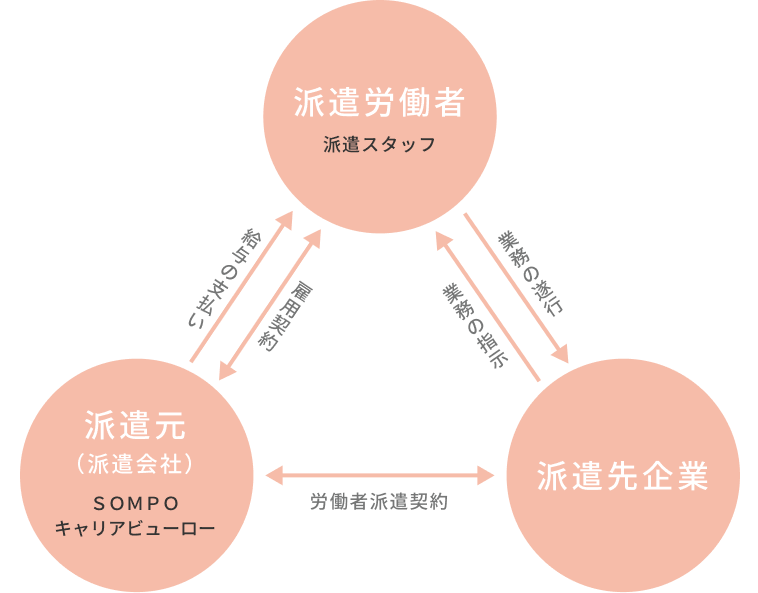 雇用主(派遣元)と実際の職場となる企業(派遣先企業)が異なる就業形態です。